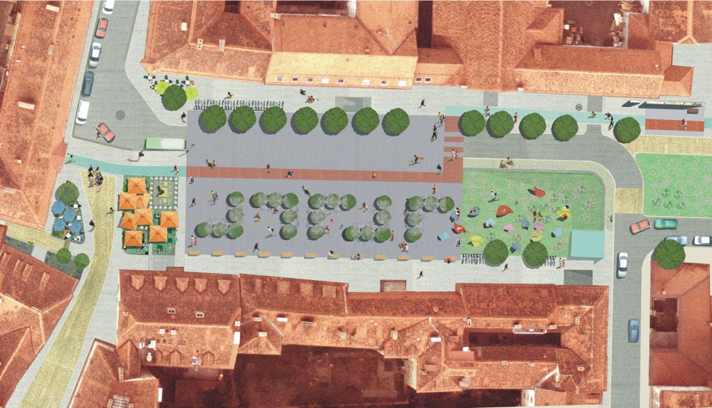 - Die Grünfläche mit derzeit hohem Baumbestand, die östlich an die Piazza angrenzt, soll zum Spielen und Rasten einladen und leuchtenden Sitz und Spielmöbel attraktiver werden.
