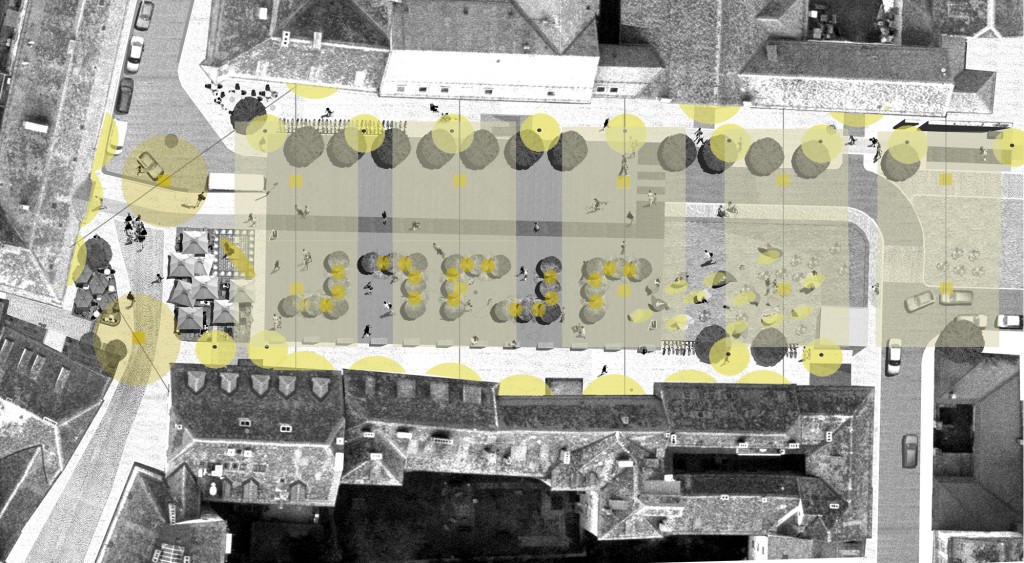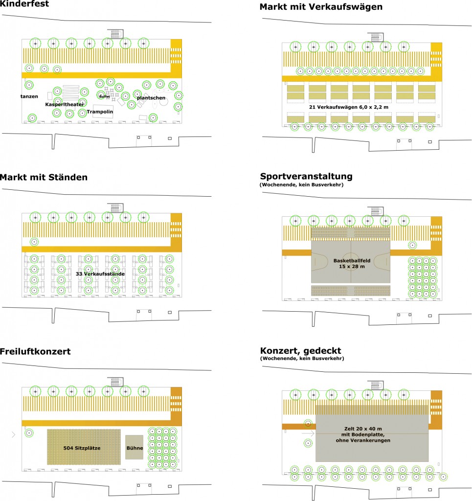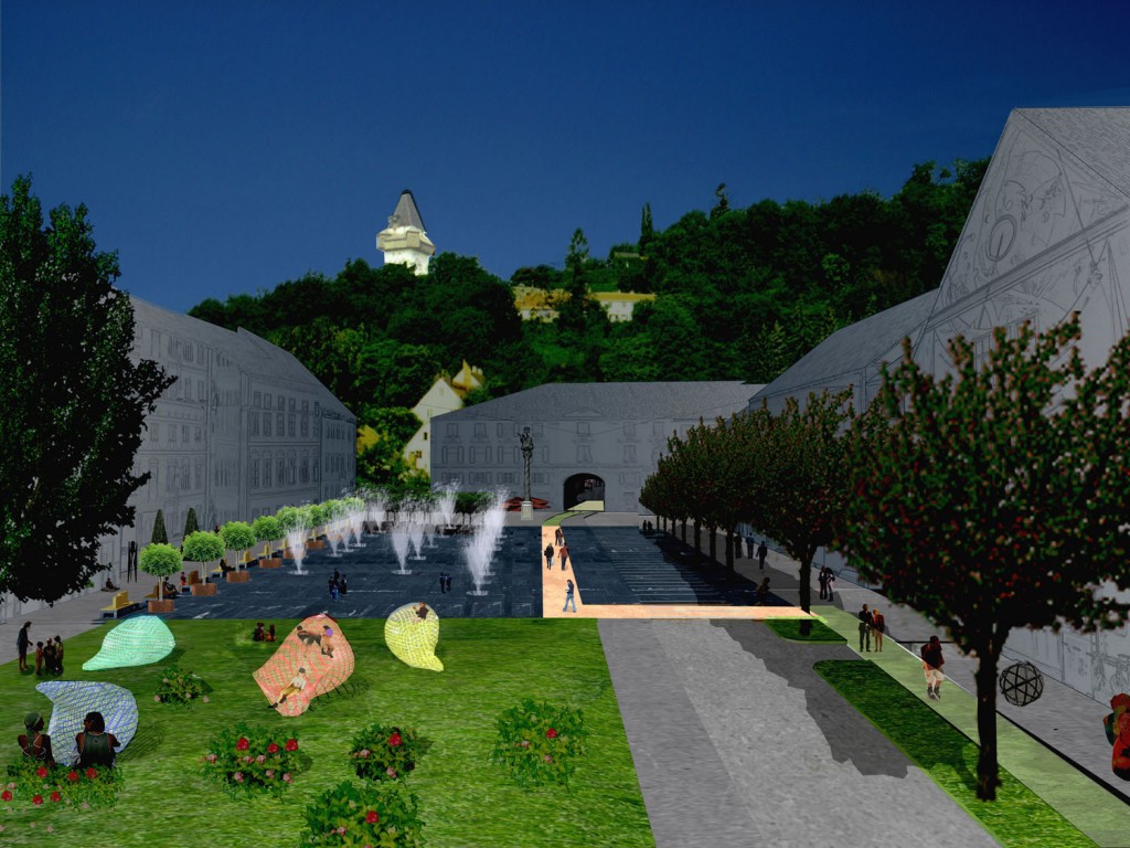 Nicht zuletzt aus der Kreuzung der beiden Achsen ergibt sich, dass der Karmeliterplatz für eine Vielfalt von Veranstaltungen attraktiv ist. Es liegt an einem klugen Management der öffentlichen Räume, dass die Art, Häufigkeit und Dauer von Veranstaltungen so gesteuert werden, dass ein langfristiger Standortnutzen entsteht. Es gibt Arten öffentlicher Ereignisse, die sehr gut in einen innerstädtischen Kontext passen, und solche, durch die der sensible Raum einer Altstadt durch ein kurzfristges Kalkül ausgebeutet wird. Die Architektur des Platzes soll den Qualitätsgedanken bestärken. Es entsteht keine Zirkuswiese, sondern eine genau definierte Piazza, eine bespielbare Plattform, begrenzt von Bäumen und Bänken, durchquert von einer Fahrspur für den Busverkehr und vom hervorgehobenen Gehweg der Kulturachse, die auf dem Weg zwischen Stadtpark und Schloßberg den Karmeliterplatz überquert. Im Alltag ist diese Piazza von Bäumen bestanden. Sie bilden ein Arborium, einen kleinen Lustgarten. Unterstützt wird der bukuolische Charakter durch die zeitweise aktivierten Fontänen, die nicht nur den Bäumen Wasser zuführen, sondern auch – man denke an laue Sommerabende – ein angenehmes Kleinklima erzeugen. Wenn eine Veranstaltung angesetzt ist, werden die Bäume mit einem Hubstapler umgruppiert und je nach Dauer und Charakter der Veranstaltung bildet das Grün sodann neue und vielfältige Räume. Alter Baumbestand soll erhalten werden.