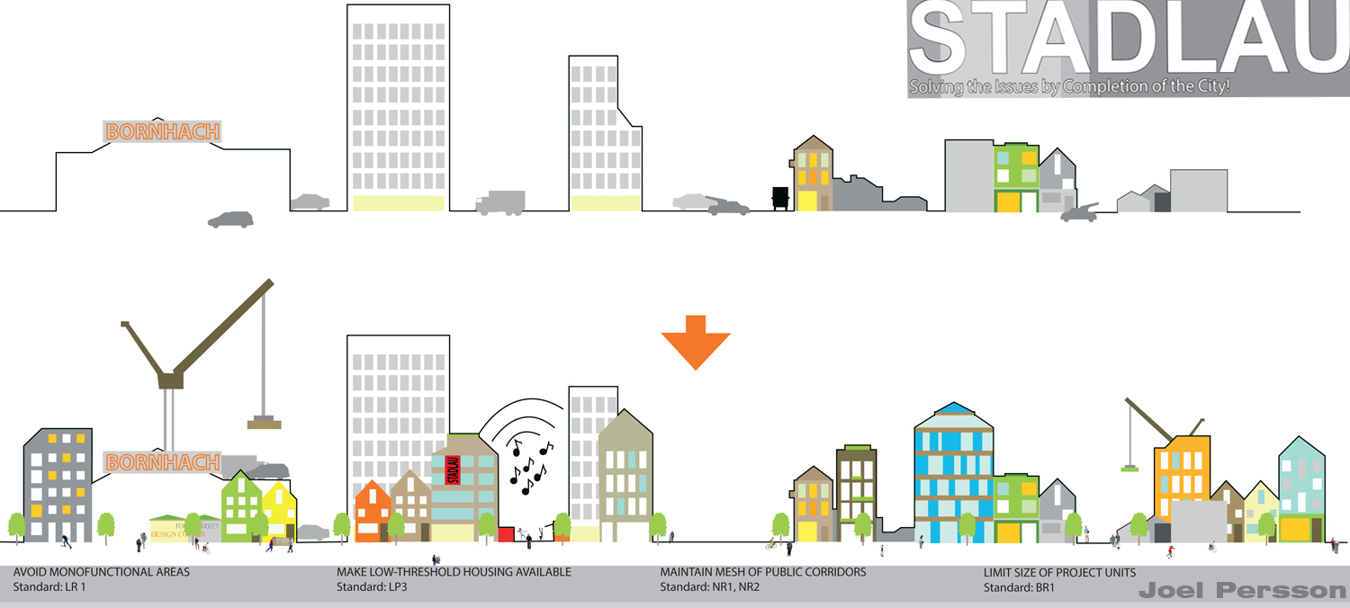 Aktivität und öffentliches Leben machen die Stadt interessant. Diese entstehen durch Nutzungsvielfalt auf engem Raum. Wohnen, Arbeiten, Lernen, Einkaufen und Freizeit sind heute nebeneinander möglich. Jedes Projekt soll dazu beitragen.