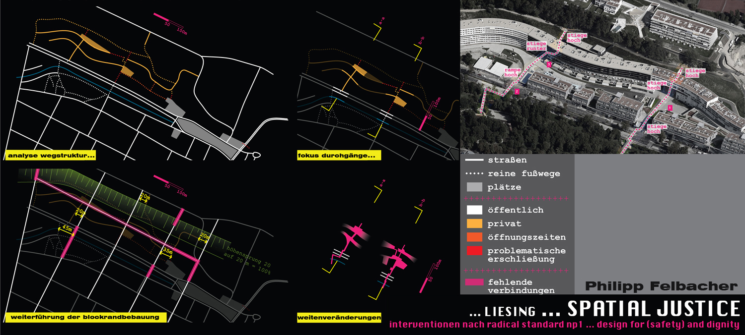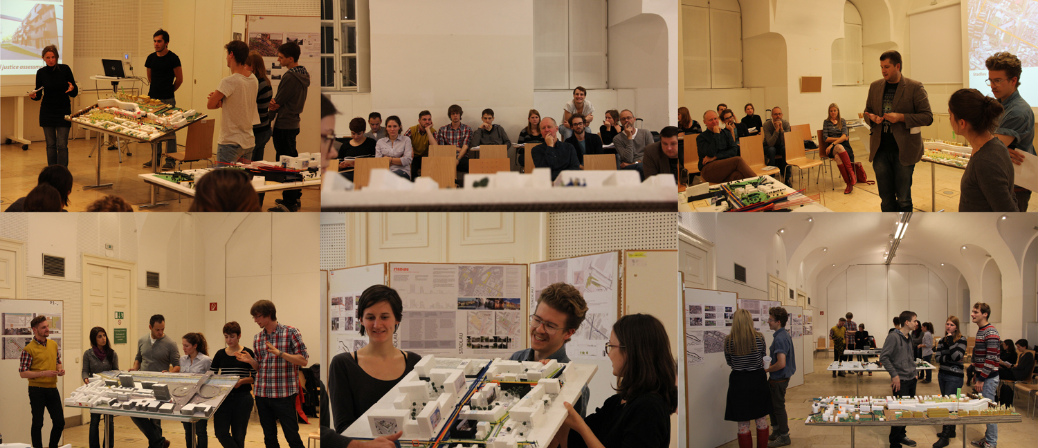 Wie gerecht ist das, was dort geschieht? Wie gerecht ist die Nutzung des öffentlichen Raumes, wie sieht es mit dem Zugang zu selbstbestimmter Gebäudenutzung, mit der Entwicklungsfähigkeit des Quartiers aus? Im Rahmen der Lehrveranstaltung werden Modelle der Gebiete gebaut, die die subjektive Wahrnehmung des Raumes und der Funktionen darstellen, und es werden Maßnahmenvorschläge für einzelne Problempunkte ausgearbeitet. Implizit kommt es bei der Diskussion zum konkreten Ort auch zu einem Hinterfragen der Kriterien der Gerechtigkeit, wie sie in den Standards formuliert sind.